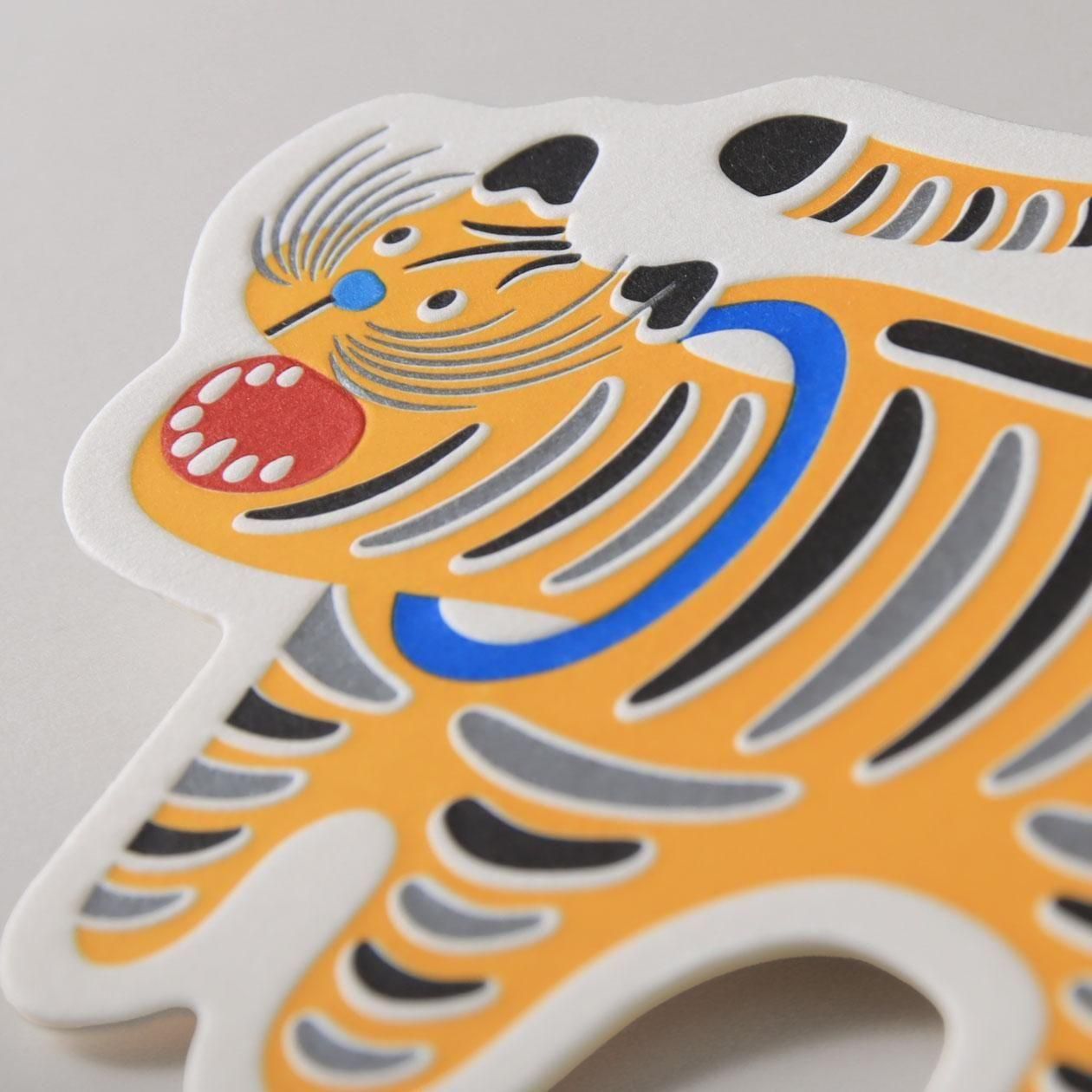 活版印刷の多色刷りにより、繊細で豊かな表現を実現。光沢のある箔押しがアクセントとなり、ダイカット加工でモチーフの形そのものの魅力を際立たせています。