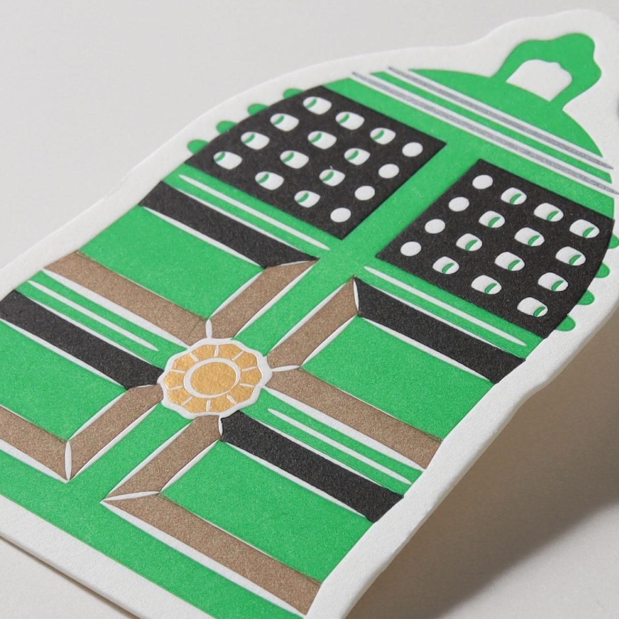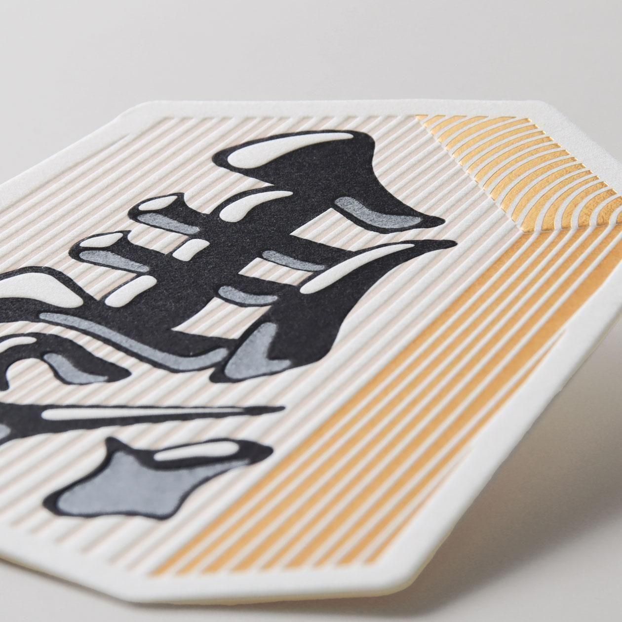 活版印刷の多色刷りにより、繊細で豊かな表現を実現。光沢のある箔押しがアクセントとなり、ダイカット加工でモチーフの形そのものの魅力を際立たせています。