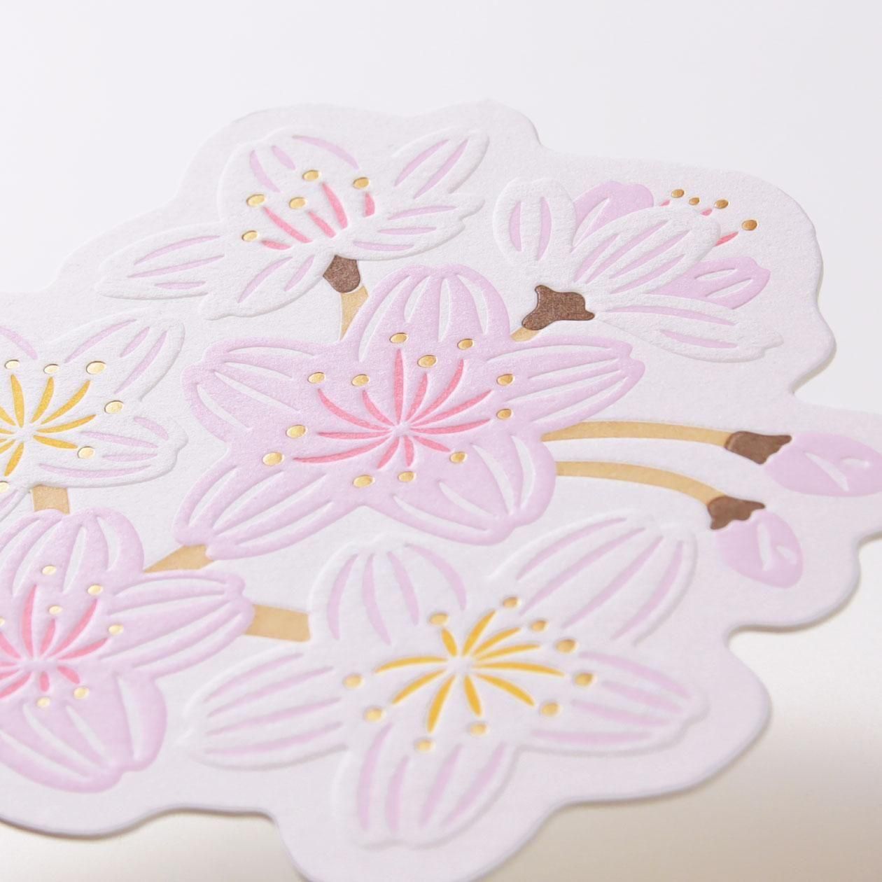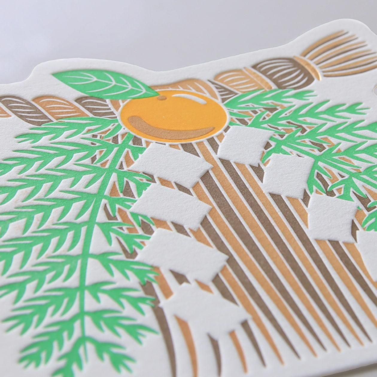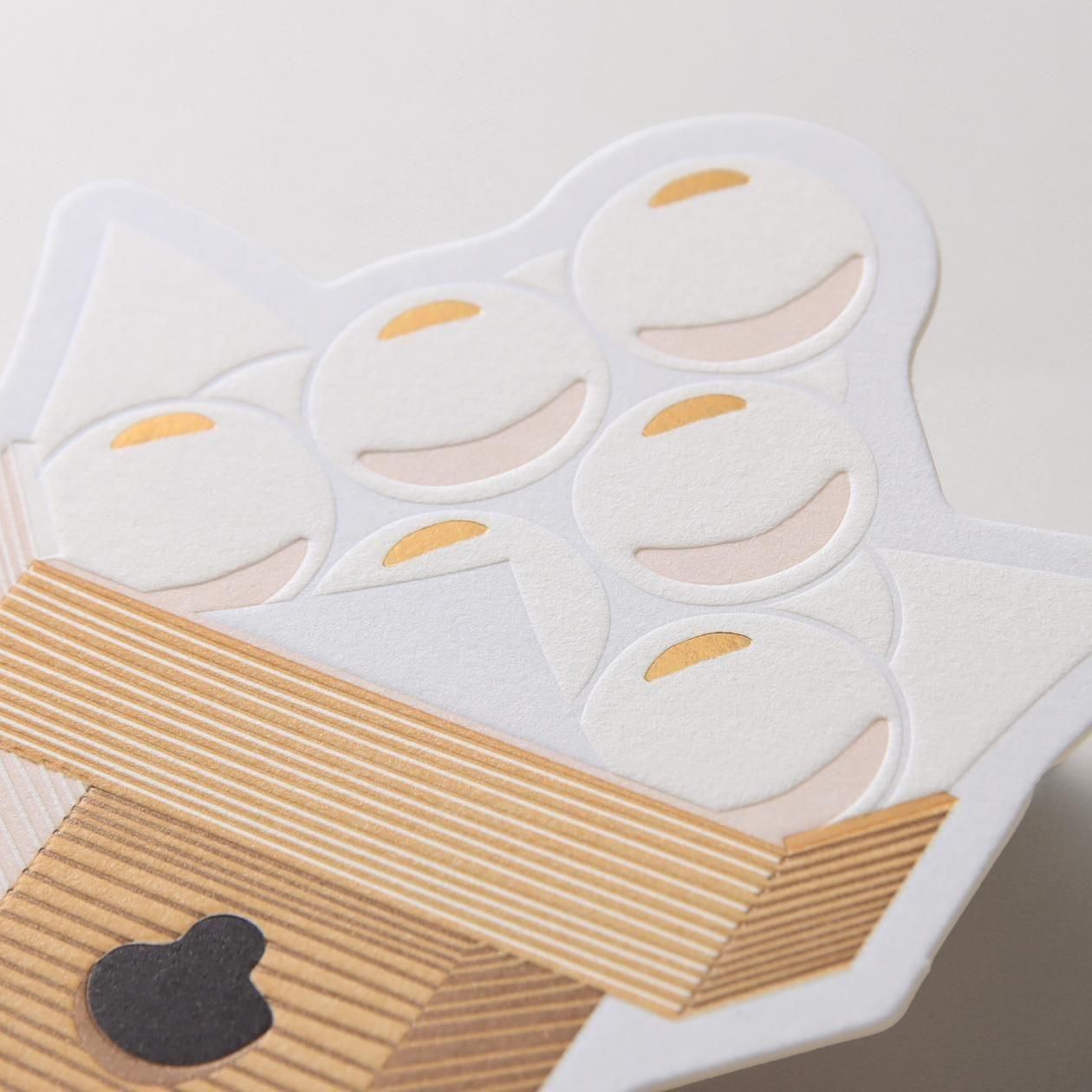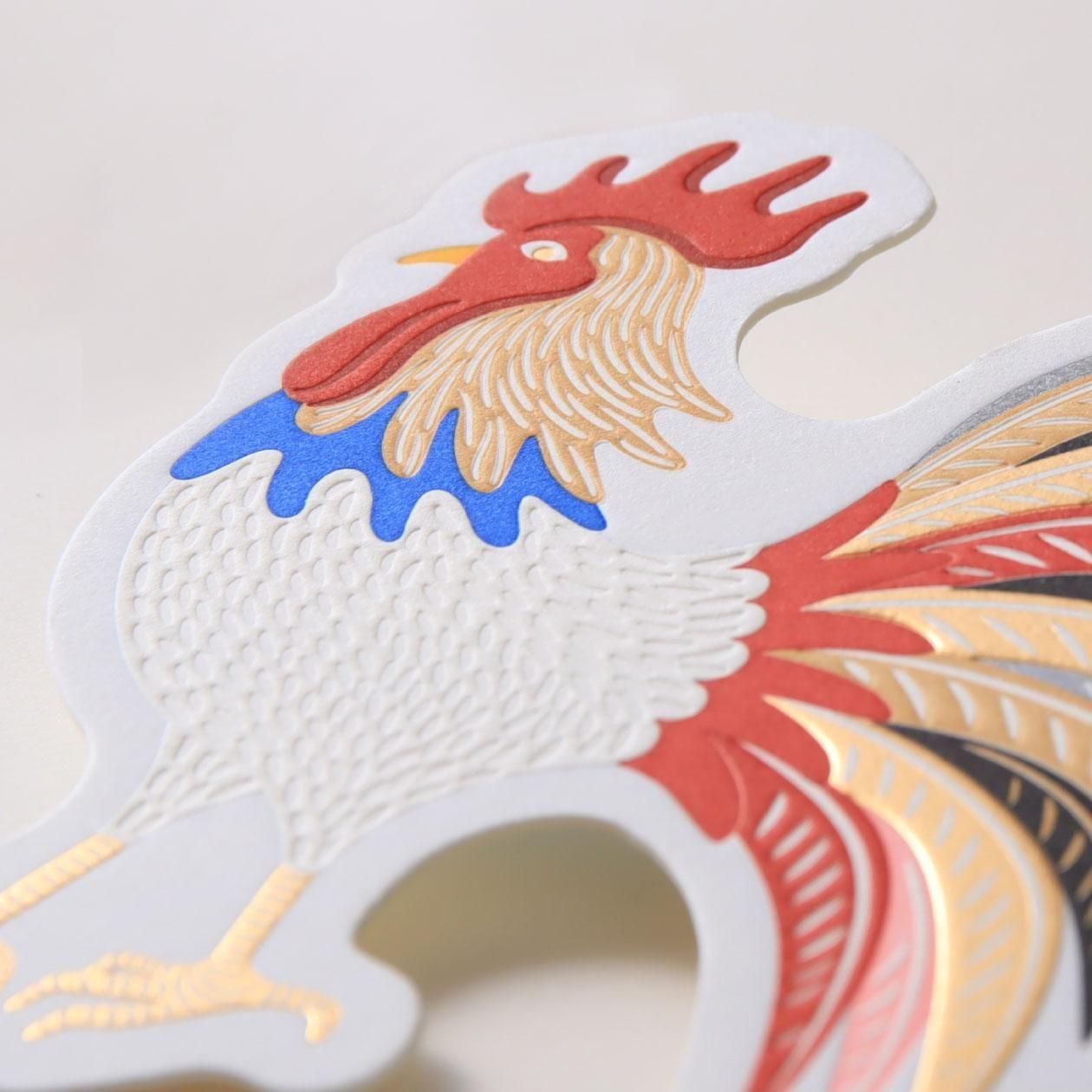 活版印刷の多色刷りにより、繊細で豊かな表現を実現。光沢のある箔押しがアクセントとなり、ダイカット加工でモチーフの形そのものの魅力を際立たせています。