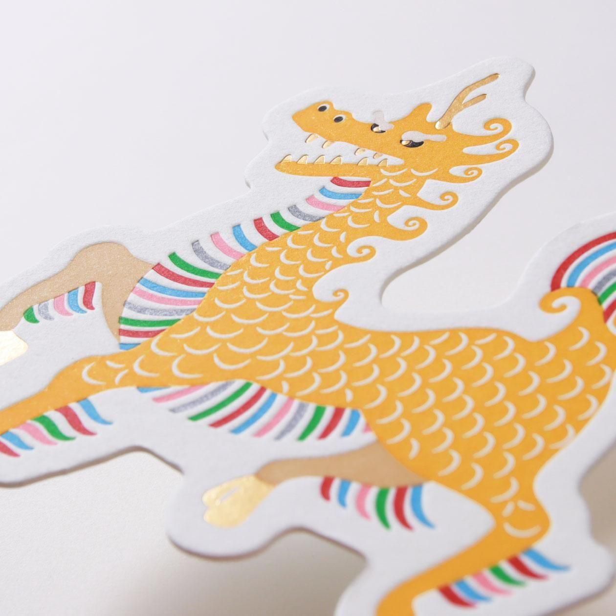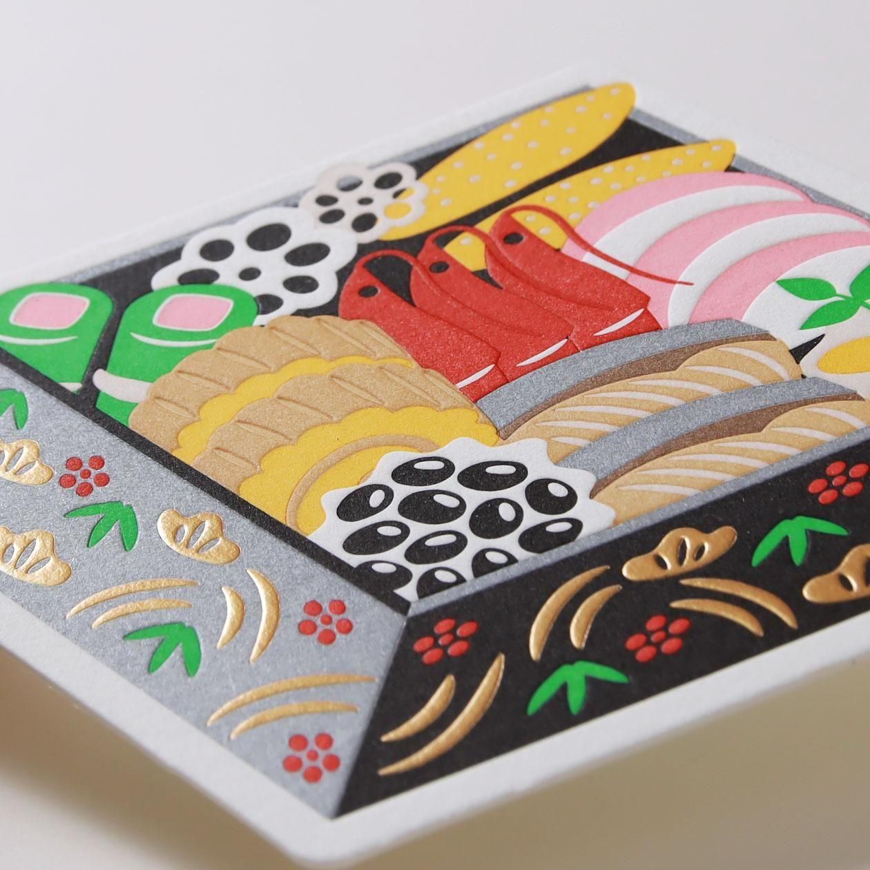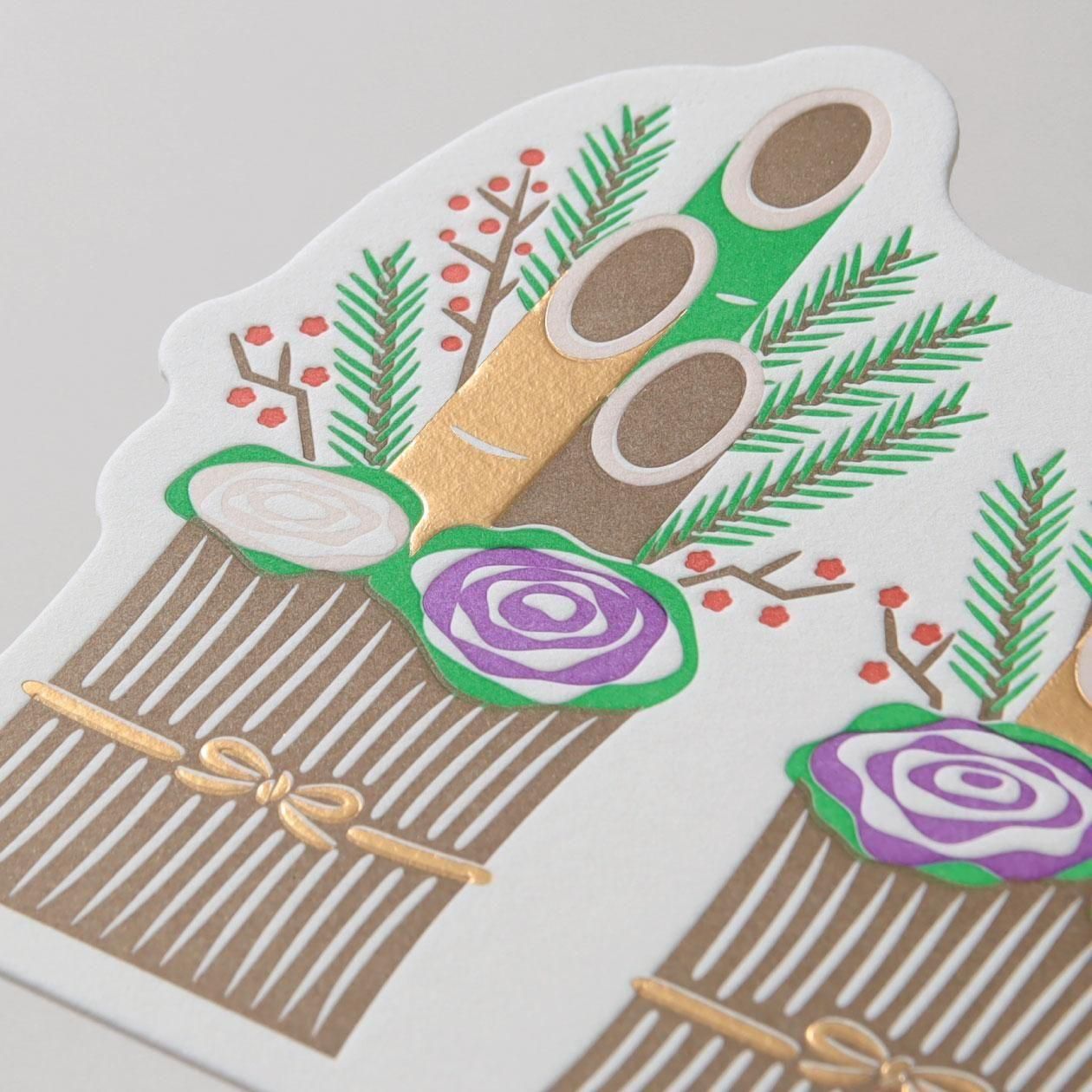 活版印刷の多色刷りにより、繊細で豊かな表現を実現。光沢のある箔押しがアクセントとなり、ダイカット加工でモチーフの形そのものの魅力を際立たせています。