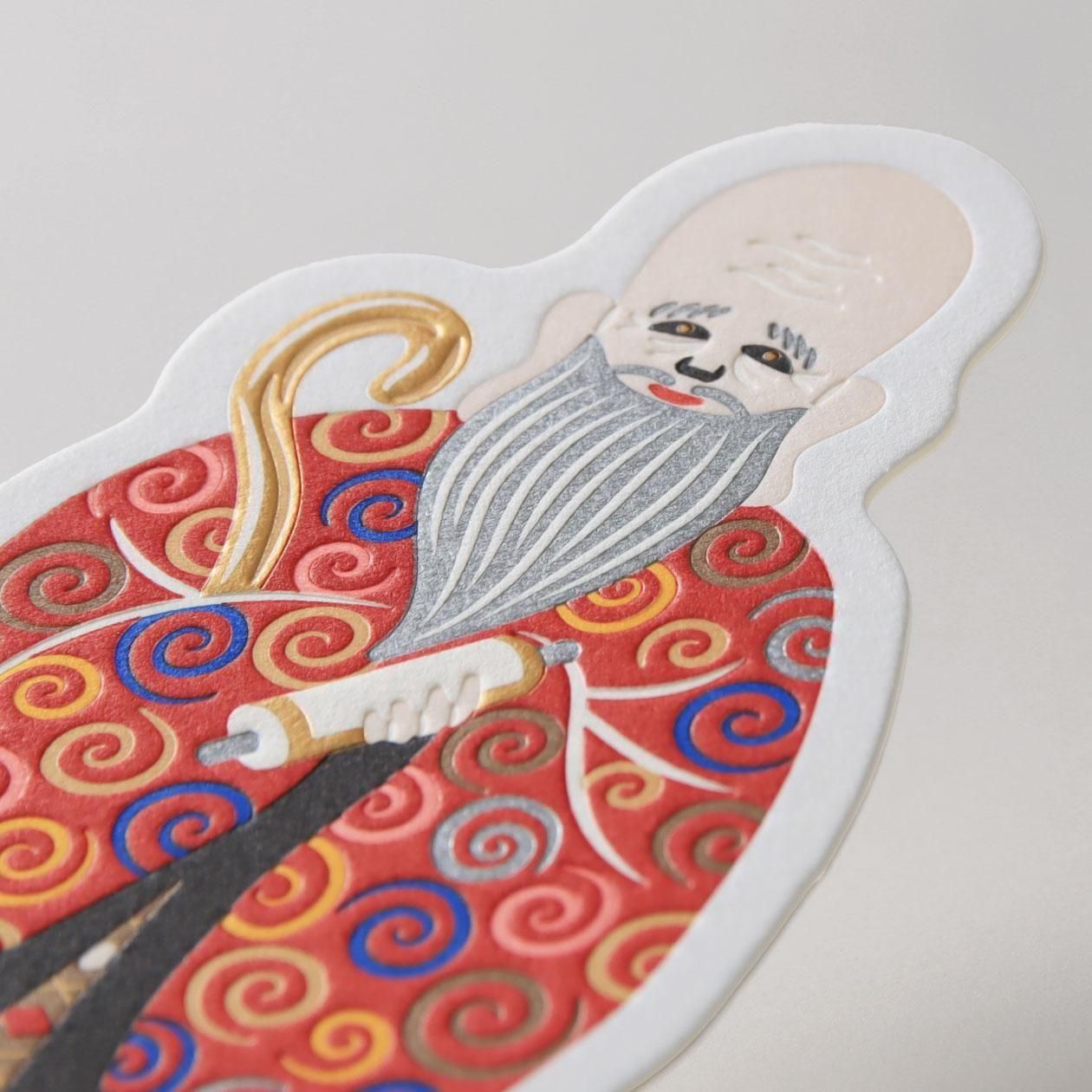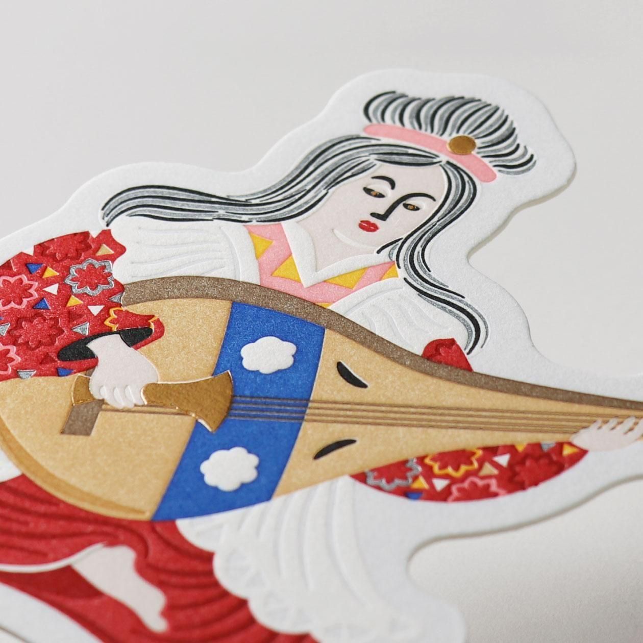 活版印刷の多色刷りにより、繊細で豊かな表現を実現。光沢のある箔押しがアクセントとなり、ダイカット加工でモチーフの形そのものの魅力を際立たせています。